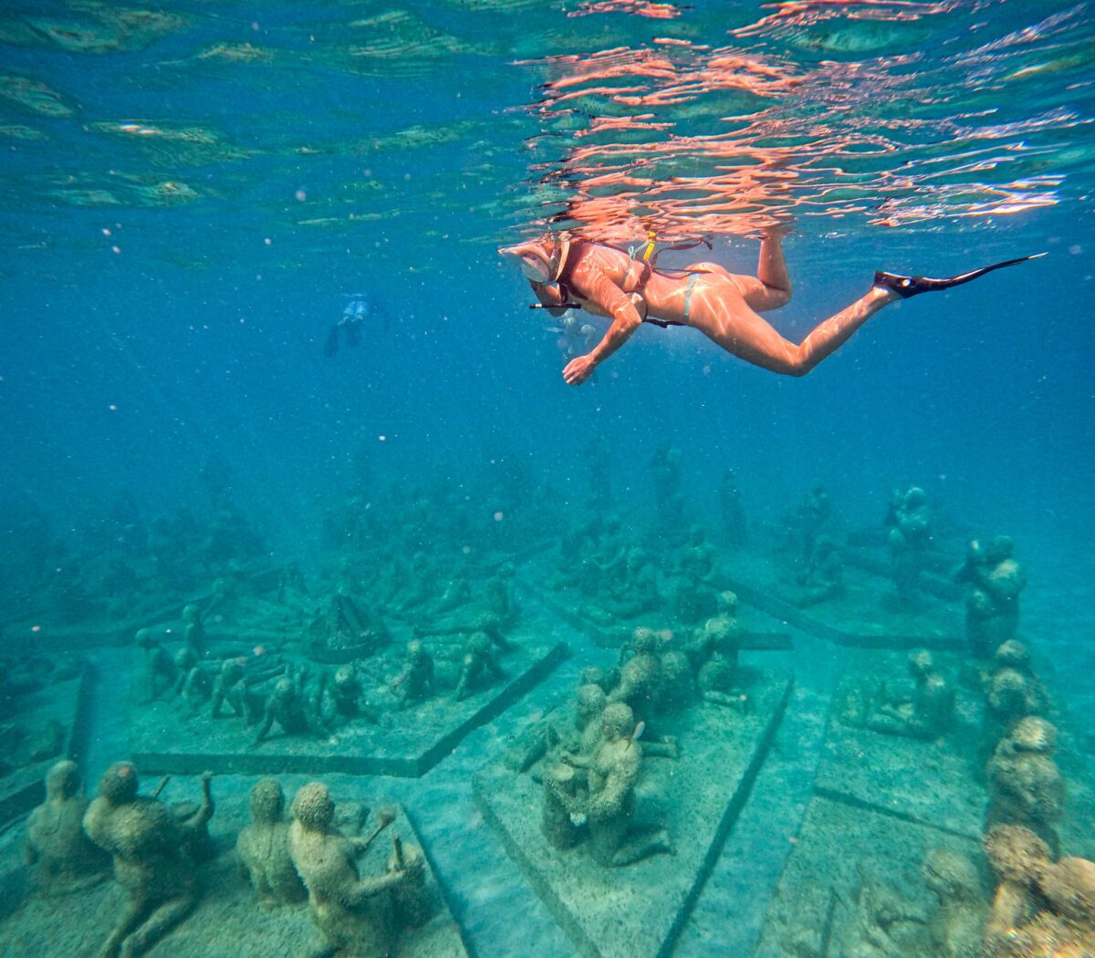 The sculptures rest only five meters below the surface, which makes them easy to reach for all skill levels. As you swim, you’ll see colorful fish, coral, and sea plants growing around the artwork. In addition, the sculptures are made of eco-friendly materials that encourage coral growth and help restore marine habitats.